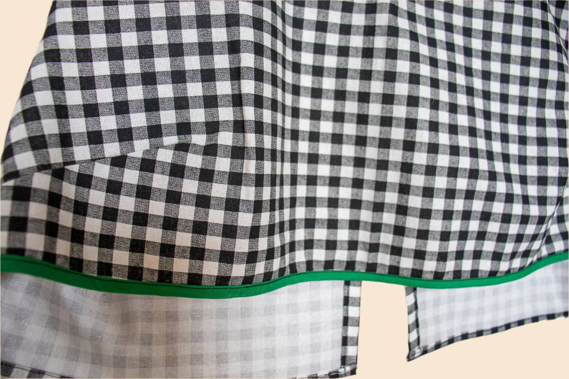 lightweight, boxy fit. right-under bust crop. single button closure. green bias hem detail.